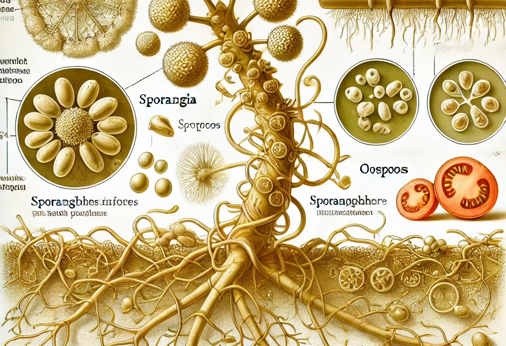 Phytophthora infestans is a species of oomycete (pseudofungus) that causes serious diseases, especially in potato and tomato plants, and causes significant damage to global agriculture.This disease, known as potato downy mildew, can cause great economic damage to producers by causing loss of productivity in potato fields.This fungus-like organism made its mark in history by causing a major potato famine in Ireland in the 19th century.In this article, we will provide comprehensive information about Phytophthora infestans, from its scientific features to its natural habitat, from its agricultural effects to its cultural importance.Scientific Name and Other NamesThis organism, whose scientific name is Phytophthora infestans, belongs to the phylum Oomycota (pseudofungi) and can cause great destruction on plants.The word Phytophthora comes from the combination of the Greek words “phyto” meaning “plant” and “phthora” meaning “destroyer” and draws attention to its ability to harm plants.It causes the disease known as potato downy mildew and may also be referred to as “potato blight” or “late blight” in some sources.Areas of Occurrence and Physical Characteristics Phytophthora infestans is common throughout the world and causes serious damage in agricultural areas in temperate climates.This pathogen, which is frequently encountered especially in regions where potatoes and tomatoes are grown, can cause infection in plant leaves, stems and fruits.It is most common in the Americas, Europe and Asia, in regions where intensive potato production occurs.When examined under the microscope, the mycelial structure of Phytophthora infestans is seen to be unsegmented and tubular.This organism produces spores called zoospores that are capable of locomotion.Zoospores can swim in the water environment and attach to the surface of plants, and thus puddles and rainy weather conditions facilitate the spread of spores.Spores of Phytophthora infestans initiate infection by settling in plant tissues and can spread rapidly in plant tissues.It forms colonies ranging from white to gray in the culture medium, and spore production increases in rainy and cool weather.Growth Habitat and Reproduction Mode Since Phytophthora infestans lives a water-dependent life, it grows and spreads rapidly in moist and cool environments.It can directly damage plant tissues and cause epidemics in fields during rainy seasons.Leaves, stems and fruits of potato and tomato plants are the organs most frequently targeted by this pathogen.Long-term moist environments are required for the infection to begin, and water accumulated on the soil surface after rain provides an ideal environment for the spread of spores.Phytophthora infestans asexually produces motile spores called zoospores.These zoospores swim in the aquatic environment, attach to plant surfaces and initiate infection.Sexual reproduction occurs through the union of structures called oogonium and antheridium, and resistant oospores are formed in this process.Oospores are resistant to adverse environmental conditions and can overwinter in the soil and germinate again in the spring.Thanks to these resistant structures, Phytophthora infestans can reoccur annually and cause epidemics.Season and Spread Period of Phytophthora infestans Phytophthora infestans becomes more active in cool and moist conditions.The rate of spread increases, especially in spring and autumn, when rainfall and low temperatures are effective.During this period, the accumulation of water droplets on the leaves of plants accelerates the spread of zoospores.If cool and rainy weather conditions continue in the summer months, epidemics may become more severe. In agricultural areas, in fields where plants are grown intensively, epidemics can spread rapidly and lead to large crop losses in a short time.Therefore, controlling weather conditions and field water flow is of great importance in combating Phytophthora infestans.Phytophthora infestans and its Effects on Agriculture Phytophthora infestans is a plant pathogen that causes serious damage to potato and tomato production worldwide.It causes the disease known as potato downy mildew, and this disease can affect the entire plant, starting from the leaves of the potato.Disease symptoms include brown spots on leaves, yellowing of leaf edges, rot on stems, and rot on potato tubers.As the infection spreads, plants begin to wilt and yield is severely reduced.The problems caused by Phytophthora infestans in agricultural production are as follows: